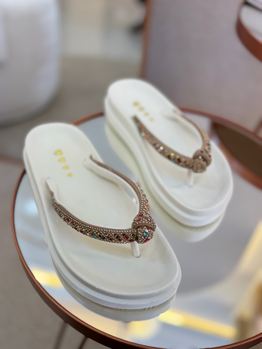 O grande destaque fica por conta das tirinhas com cristais coloridos, que dão um toque moderno, divertido e delicado ao mesmo tempo, tornando esse flat uma opção versátil para diversas ocasiões. A cor Off White é clássica, neutra e fácil de combinar, ideal para looks casuais ou produções mais despojadas.