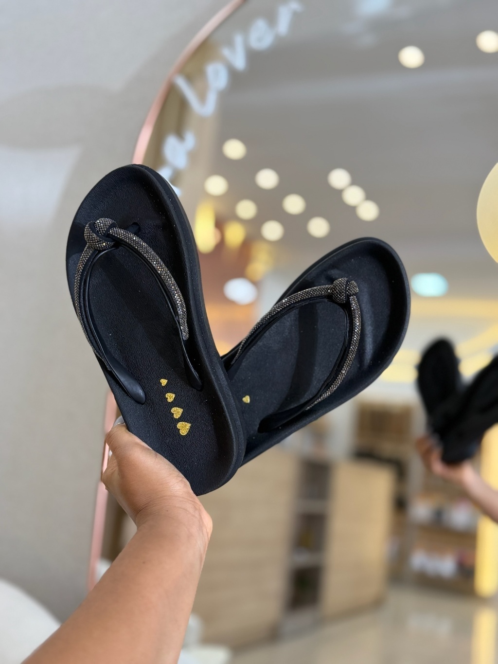 O grande destaque fica por conta das tirinhas com pedrinhas escuras tipo ônix, que dão um toque elegante, moderno e delicado ao mesmo tempo, tornando esse flat uma opção sofisticada para diversas ocasiões. A cor preta é clássica, elegante e fácil de combinar, ideal para looks casuais ou produções mais refinadas.