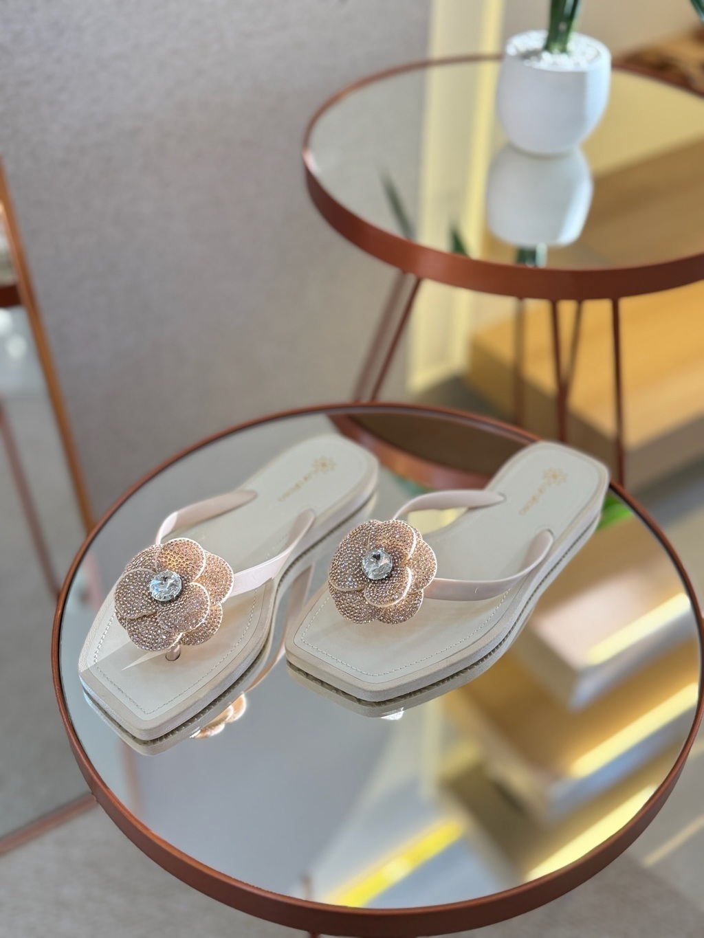Seu grande destaque está na aplicação em flor com glitter dourado rosado e pedraria cristal no centro, que transforma um chinelo básico em um calçado cheio de personalidade e sofisticação.