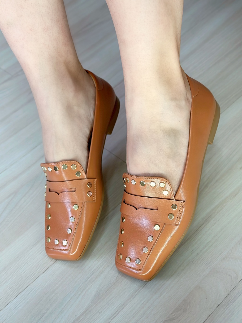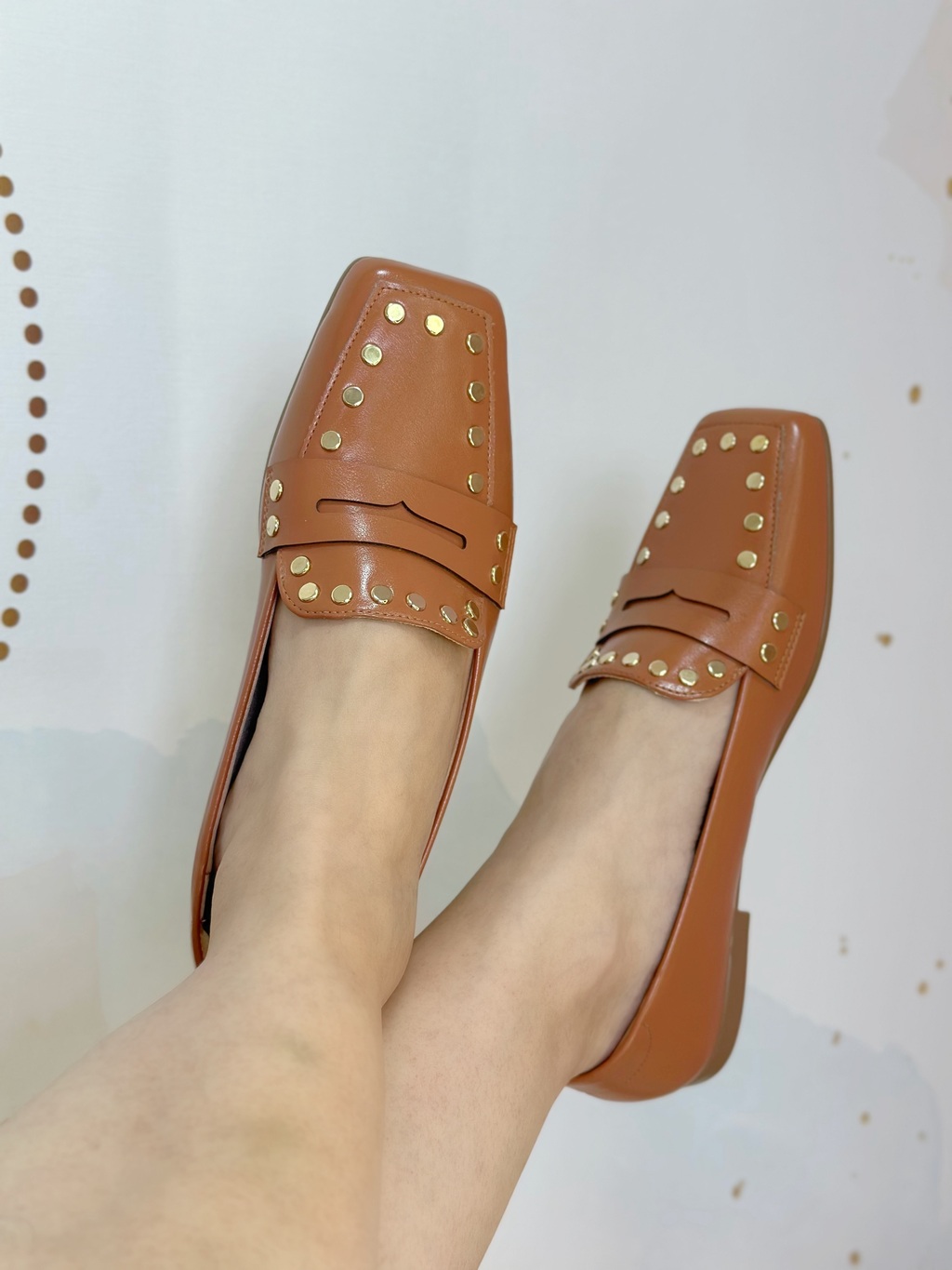 As tachas metálicas douradas aplicadas no cabedal dão um toque fashion e moderno, transformando o clássico mocassim em um sapato cheio de atitude. Além disso, a sola antiderrapante garante segurança a cada passo, enquanto o interior macio proporciona bem-estar durante todo o dia.