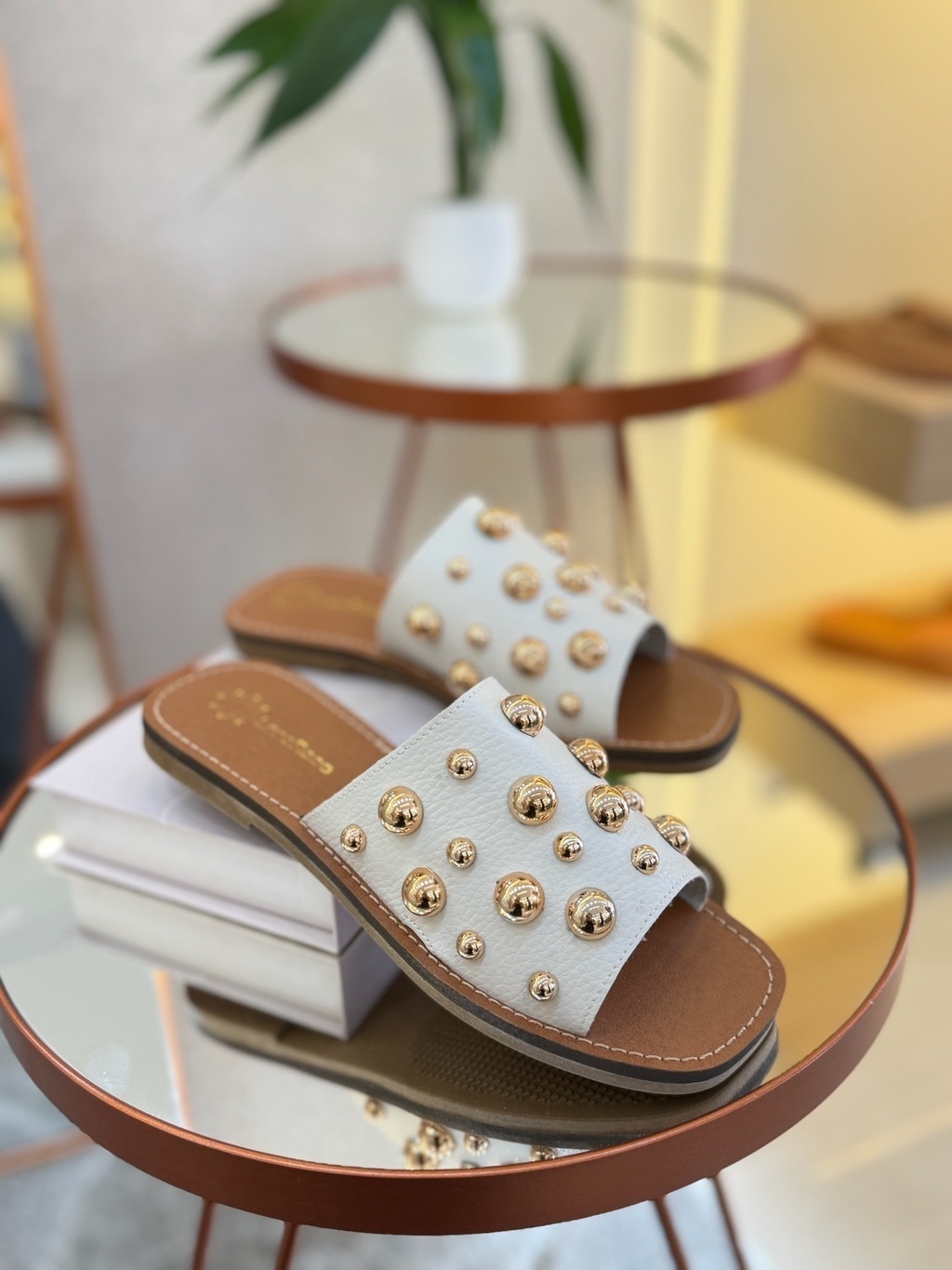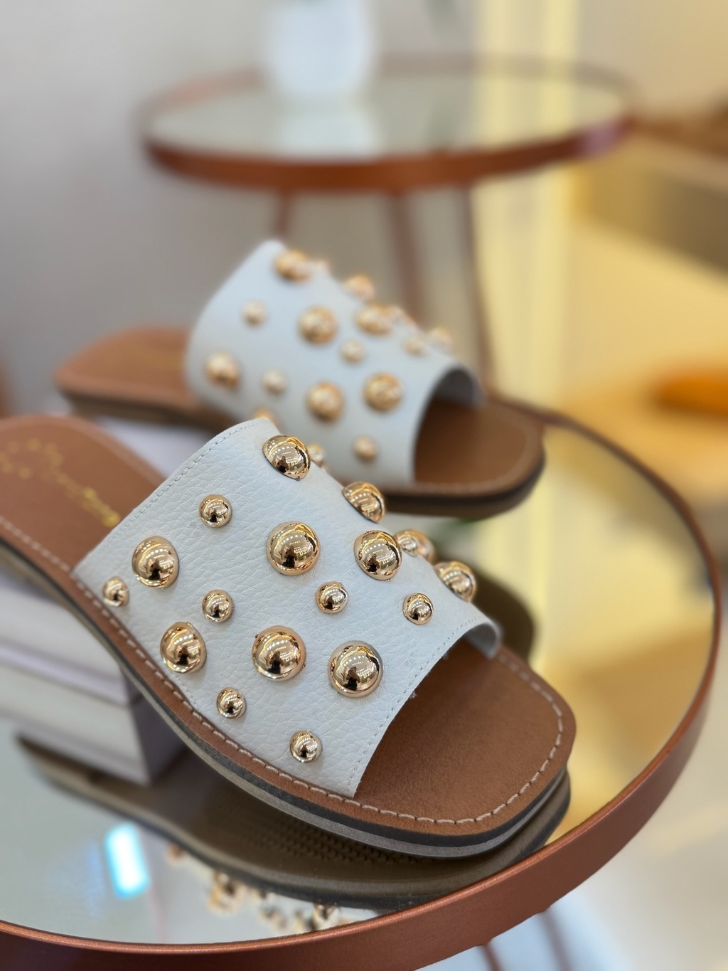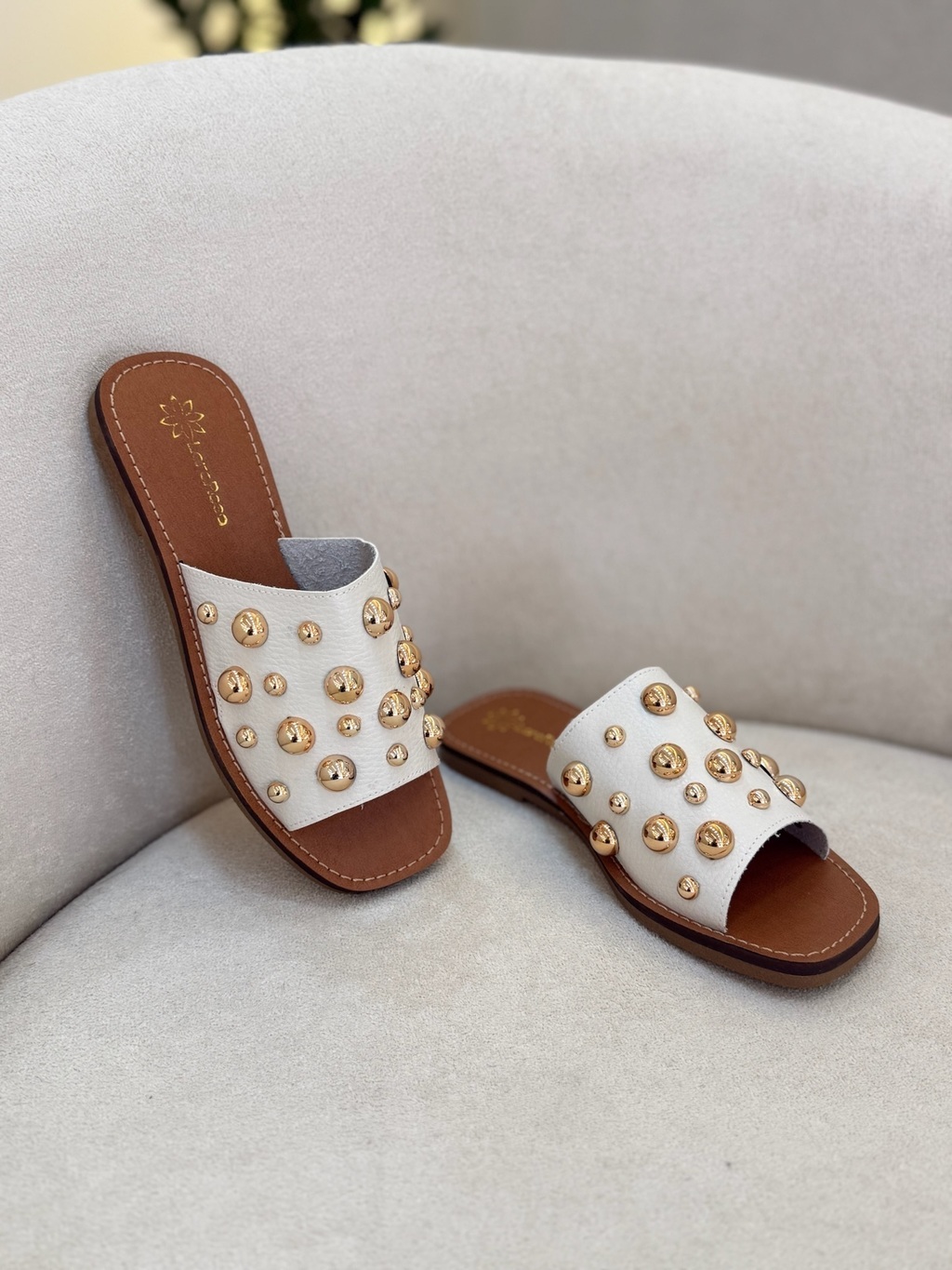 A Rasteira Feminina Isis da Lara Rosa na cor Off White é a união perfeita entre modernidade e sofisticação. Seu design minimalista ganha destaque com a aplicação de tachas douradas, que trazem um toque de atitude e elegância ao look.