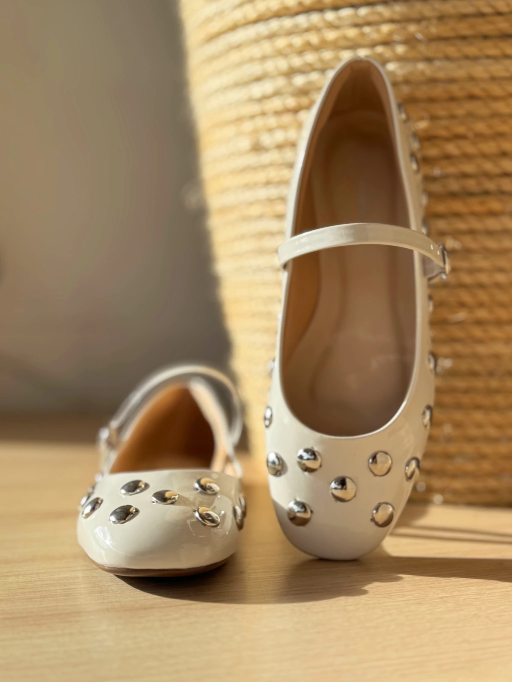 Conquiste olhares com a Sapatilha Alana off-white com tachas metalizadas ! Um modelo super fashionista, que une conforto e atitude em um só produto.
