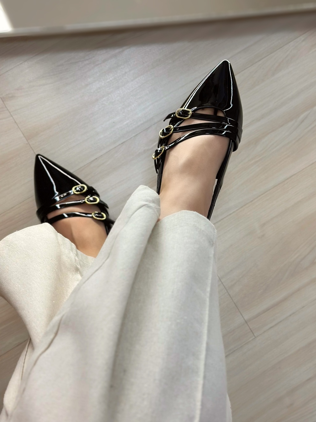 Se você ama estilo, brilho e atitude, esse mule é o seu novo queridinho! Com acabamento em verniz preto super elegante e tiras com fivelas douradas, esse modelo é um verdadeiro destaque no look.
