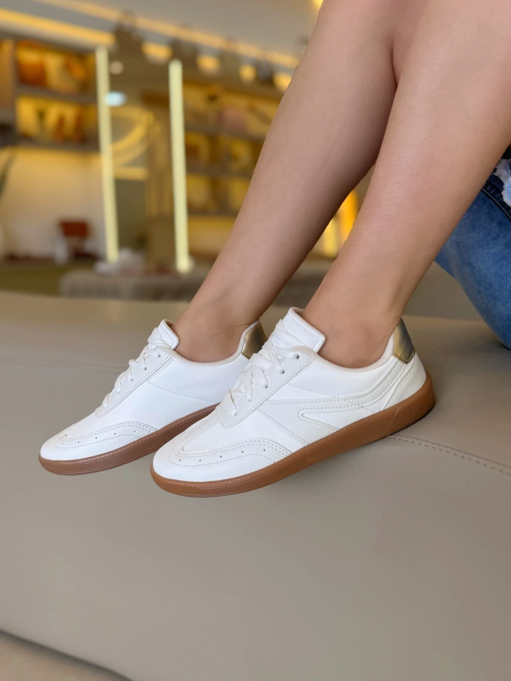 O Tênis Casual Anita Branco com Detalhe Dourado e Sola Caramelo é a combinação perfeita entre estilo, conforto e praticidade. Criado para mulheres que desejam estar bem vestidas em qualquer ocasião, ele une o design moderno do branco clássico ao detalhe sofisticado em dourado no calcanhar, trazendo um toque fashion que faz toda a diferença.
